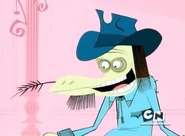 Chester is a white vulture-like imaginary friend with brown hair on his head and chin. He wears a light blue cowboy jacket, dark blue cowboy hat (which is big enough for Bloo to hide under) and pants, black cowboy boots, and a black belt with an eagle as its buckle and chews on a strand of wheat. Nester is much smaller than Chester and somewhat resembles Clyde, the orange Pac-Man ghost. He has black arms and legs and wears white gloves. They both speak with heavy southern American accents.