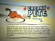 Creaky Pete first appeared in "The Trouble With Scribbles". He overhears Bloo pondering what could be behind the secret door and then proceeds to tell him "the story of the secret of the secret door." However, Creaky Pete's story consisted of nonspecific details and broad information, such as "in this house" and "in that room." He concluded his story by stating that "something happened behind that door," and that everyone swore that they'd never speak of it again, much to Bloo's chagrin. Later that same episode, he becomes lazy enough to make one of the Scribbles rock his chair.