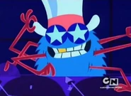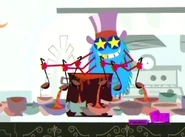 DJ wears a purple (or grey) Top hat on his head. His eyes are a darkish blue with yellow star pupils (they may also be glasses). He is covered in blue fur, has three sets of red arms, and one of his upper teeth is golden/yellow.