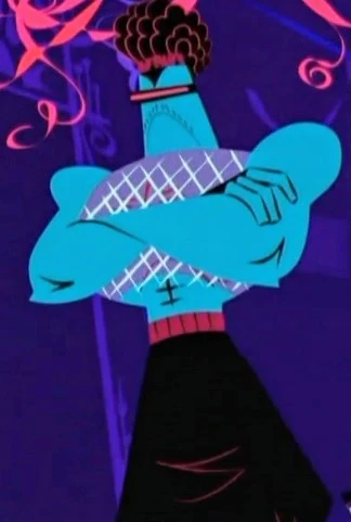 Dancey Pantalones is a tall, blue, muscular imaginary friend with an afro and a thin mustache. He wears a mesh shirt, red headband, black pants, red visor glasses, red socks, and black shoes.