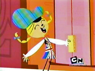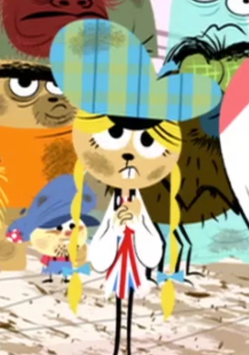 Eurotrish is a humanlike imaginary friend with a chipmunk-like face, blonde hair with two braids, and a thick accent that supposedly sounds Italian. She wears yellow clogs, a blue-and-green plaid beret, two blue bowties in her hair, a red bandana, and a dress with the British Union Jack on it.